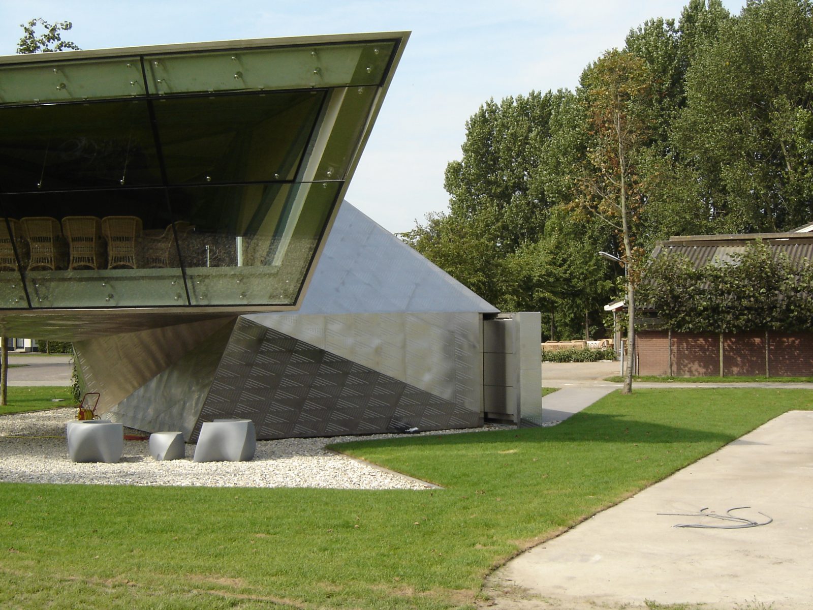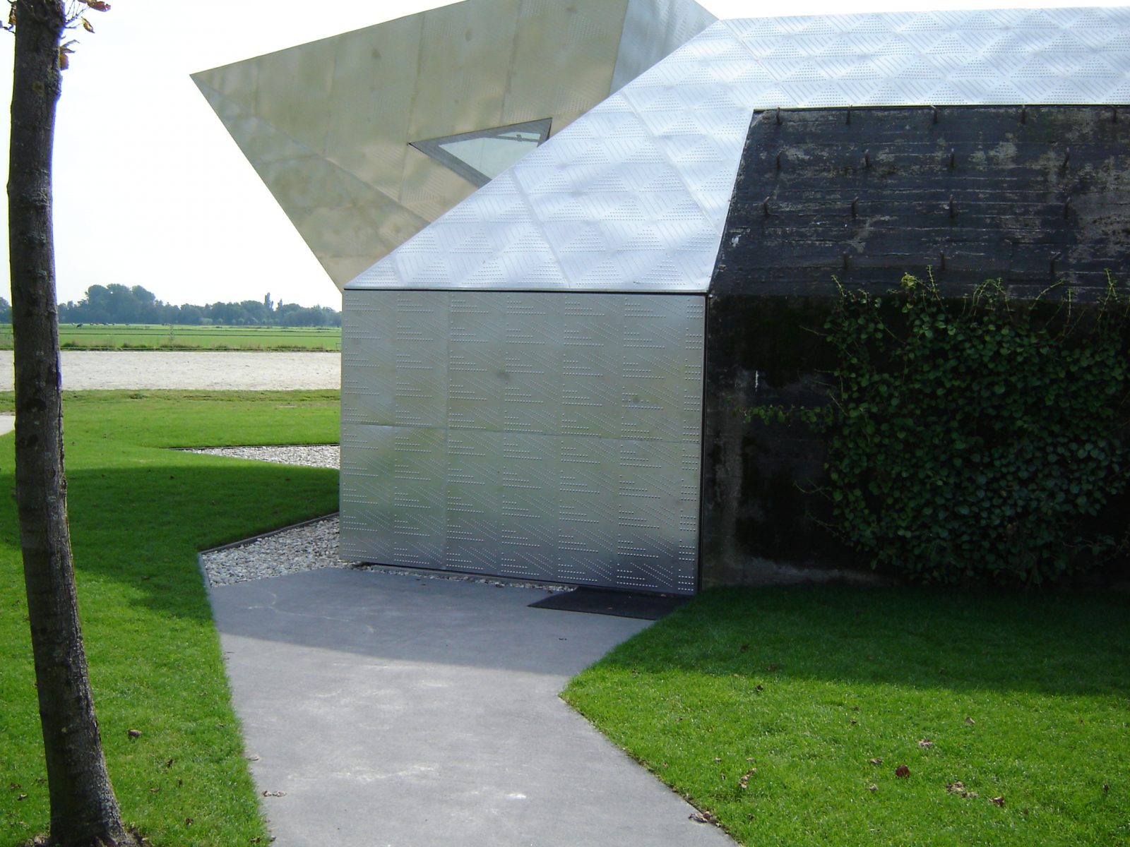 Dieser Bunker aus dem Zweiten Weltkrieg dient heute als Clubhaus für einen Poloclub. Das Clubhaus verfügt über ein elegantes architektonisches Design. Der Wunsch des Bauherrn war es, das Tor zu einem Teil dieses Entwurfs zu machen.