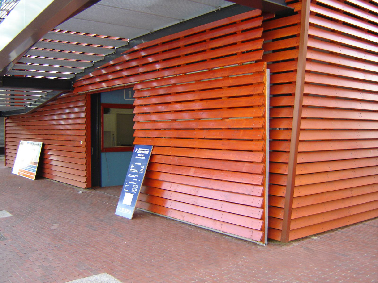 This is a bicycle pavilion in Zoetermeer where overhead doors and a sliding door had to form one entity with the façade. In the bicycle pavilion, there is space for a supervised bicycle park via the entrance that is closed with a sliding door. Moreover, the façade elements close off different kiosks in the pavilion. These façade overhead doors are insulated and covered with wood but it is also possible to use other materials for this application such as glass, concrete or grids.